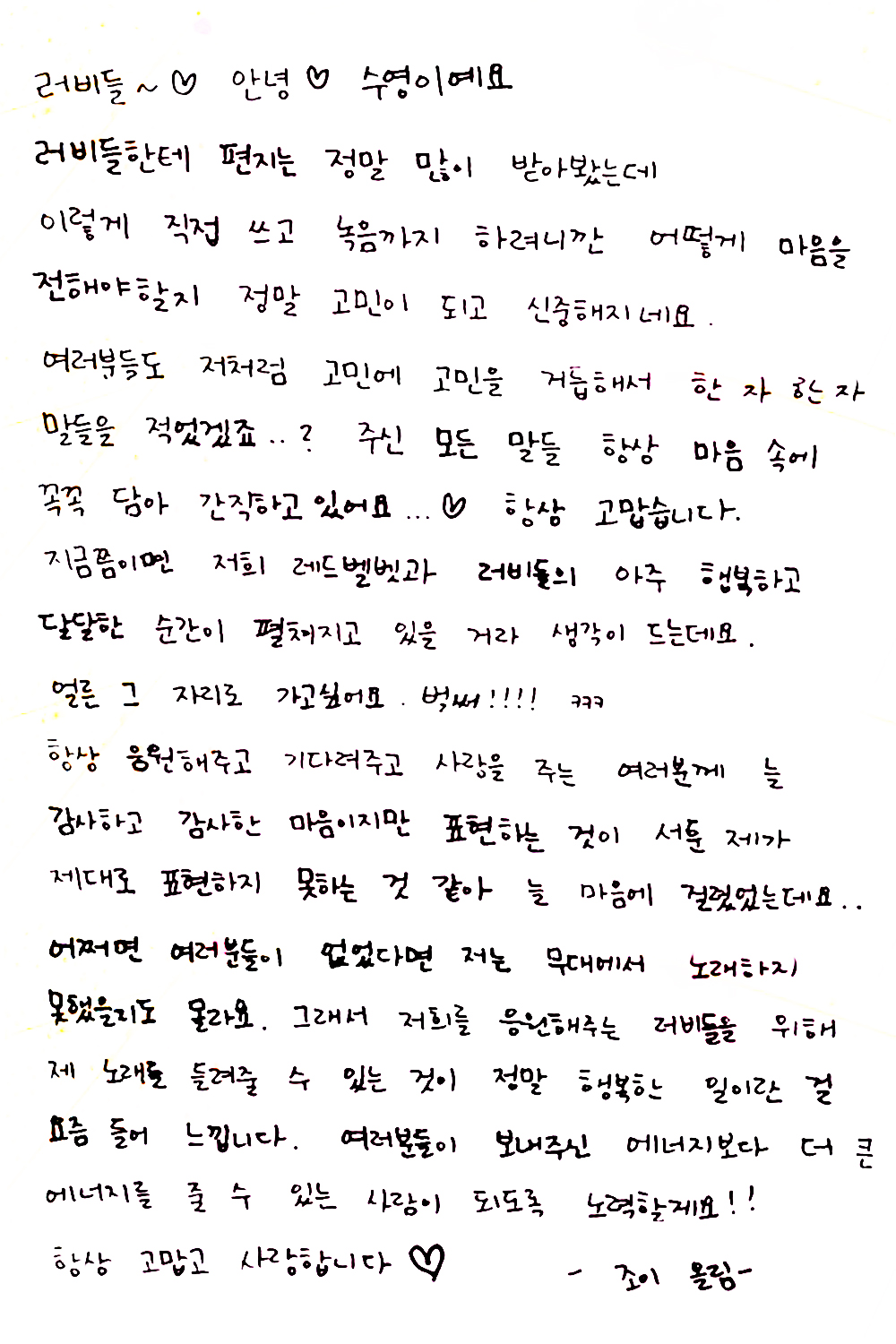 러비들한테 편지는 정말 많이 받아봤는데 이렇게 직접 쓰고 녹음까지 하려니깐 어떻게 마음을 전해야 할지 정말 고민이 되고 신중해지네요. 여러분들도 저처럼 고민에 고민을 거듭해서 한 자 한 자 말들을 적었겠죠..? 주신 모든 말들 항상 마음속에 꼭꼭 담아 간직하고 있어요...♡ 항상 고맙습니다.